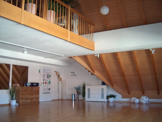 Der ruhige ca. 100m2 grosse Bewegungsraum mit Tageslicht eignet sich mit seiner warmen schönen Atmosphäre sehr gut für die Körper- und Bewusstseinsarbeit. Seine wohltuende Energie empfängt den Gast und lässt ihn den Alltag vergessen und regenerieren.